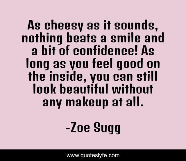 This page presents the quote "As cheesy as it sounds, nothing beats a smile and a bit of confidence! As long as you feel good on the inside, you can still look beautiful without any makeup at all.". Author of this quote is Zoe Sugg. This quote is about beautiful, confidence, good,.