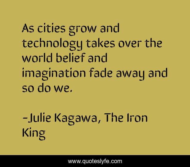 This page presents the quote "As cities grow and technology takes over the world belief and imagination fade away and so do we.". Author of this quote is Julie Kagawa, The Iron King. This quote is about imagination, magic, technology, faery, science,.