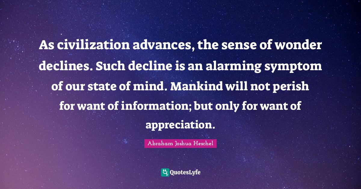 This page presents the quote "As civilization advances, the sense of wonder declines. Such decline is an alarming symptom of our state of mind. Mankind will not perish for want of information; but only for want of appreciation.". Author of this quote is Abraham Joshua Heschel. This quote is about state of mind, decline, civilization, mankind, sense of wonder, appreciation, mind, want, information,.