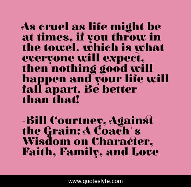 This page presents the quote "As cruel as life might be at times, if you throw in the towel, which is what everyone will expect, then nothing good will happen and your life will fall apart. Be better than that!". Author of this quote is Bill Courtney, Against the Grain: A Coach's Wisdom on Character, Faith, Family, and Love. This quote is about life, good, towel, fall, bad, better, cruel, expect, time,.
