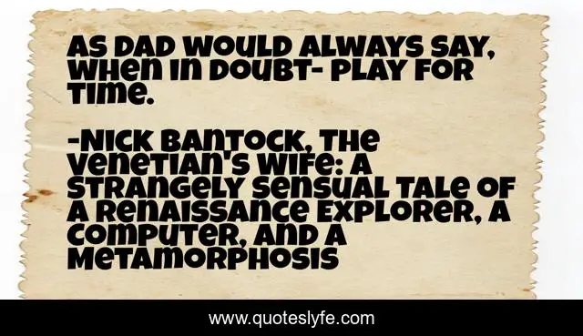 This page presents the quote "As dad would always say, when in doubt- play for time.". Author of this quote is Nick Bantock, The Venetian's Wife: A Strangely Sensual Tale of a Renaissance Explorer, a Computer, and a Metamorphosis. This quote is about nick-bantock, doubt, fatherly-advice, time,.