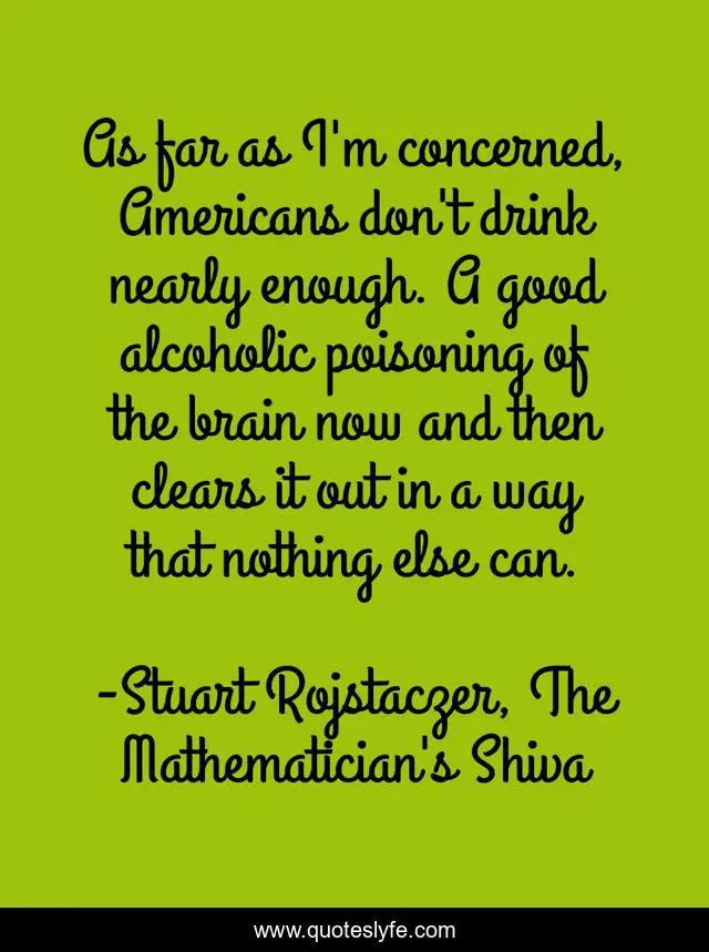 This page presents the quote "As far as I'm concerned, Americans don't drink nearly enough. A good alcoholic poisoning of the brain now and then clears it out in a way that nothing else can.". Author of this quote is Stuart Rojstaczer, The Mathematician's Shiva. This quote is about brain, drink, alcoholic,.