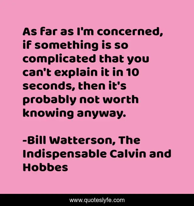This page presents the quote "As far as I'm concerned, if something is so complicated that you can't explain it in 10 seconds, then it's probably not worth knowing anyway.". Author of this quote is Bill Watterson, The Indispensable Calvin and Hobbes. .