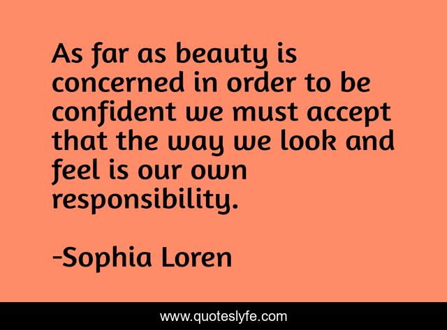 This page presents the quote "As far as beauty is concerned in order to be confident we must accept that the way we look and feel is our own responsibility.". Author of this quote is Sophia Loren. This quote is about self, reliance,.