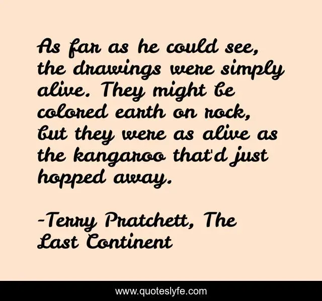 This page presents the quote "As far as he could see, the drawings were simply alive. They might be colored earth on rock, but they were as alive as the kangaroo that'd just hopped away.". Author of this quote is Terry Pratchett, The Last Continent. .