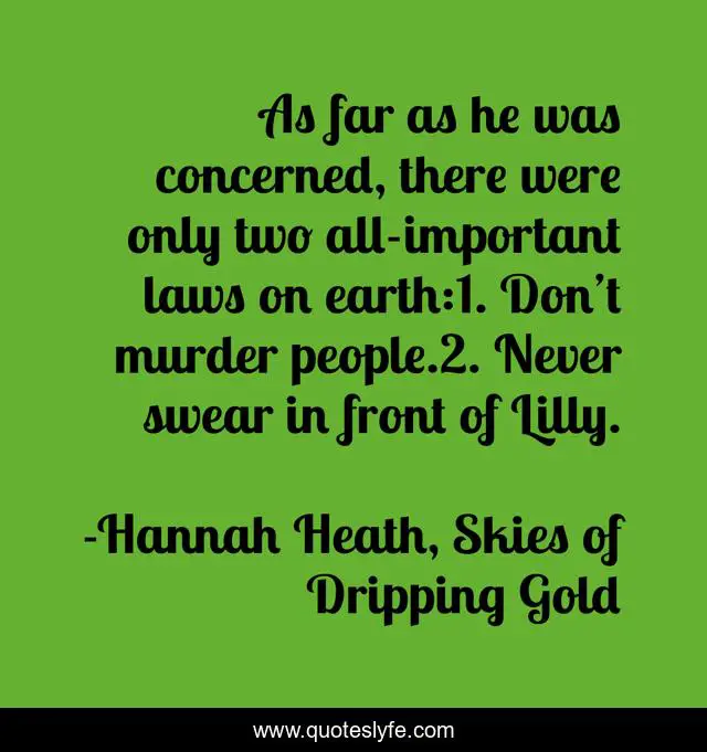 This page presents the quote "As far as he was concerned, there were only two all-important laws on earth:1. Don’t murder people.2. Never swear in front of Lilly.". Author of this quote is Hannah Heath, Skies of Dripping Gold. This quote is about skies-of-dripping-gold, humor, humorous, christian-fiction, christian-dystopian, hannah-heath,.