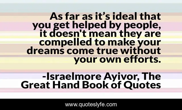 This page presents the quote "As far as it’s ideal that you get helped by people, it doesn't mean they are compelled to make your dreams come true without your own efforts.". Author of this quote is Israelmore Ayivor, The Great Hand Book of Quotes. This quote is about food-for-thought, as-far-as, dream-big, people, big-dreams, compel, ideal, compelled, effort,.