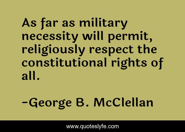 This page presents the quote "As far as military necessity will permit, religiously respect the constitutional rights of all.". Author of this quote is George B. McClellan. This quote is about military, rights,.