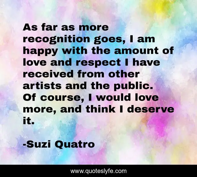 This page presents the quote "As far as more recognition goes, I am happy with the amount of love and respect I have received from other artists and the public. Of course, I would love more, and think I deserve it.". Author of this quote is Suzi Quatro. This quote is about love, affection, happy,.