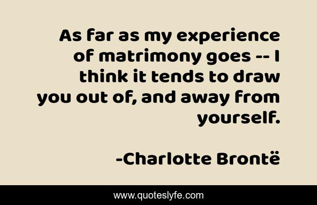 This page presents the quote "As far as my experience of matrimony goes -- I think it tends to draw you out of, and away from yourself.". Author of this quote is Charlotte Brontë. This quote is about matrimony, marriage,.