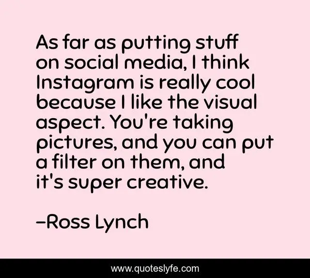 This page presents the quote "As far as putting stuff on social media, I think Instagram is really cool because I like the visual aspect. You're taking pictures, and you can put a filter on them, and it's super creative.". Author of this quote is Ross Lynch. This quote is about social media, media,.