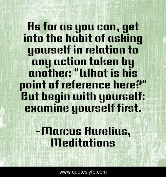 This page presents the quote "As far as you can, get into the habit of asking yourself in relation to any action taken by another: "What is his point of reference here?" But begin with yourself: examine yourself first.". Author of this quote is Marcus Aurelius, Meditations. This quote is about frame-of-reference, empathy, self-actualization, questioning,.