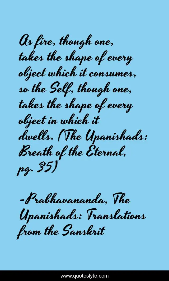 This page presents the quote "As fire, though one, takes the shape of every object which it consumes, so the Self, though one, takes the shape of every object in which it dwells. (The Upanishads: Breath of the Eternal, pg. 35)". Author of this quote is Prabhavananda, The Upanishads: Translations from the Sanskrit. This quote is about eastern-philosophy, hinduism, brahman, upanishads, self,.