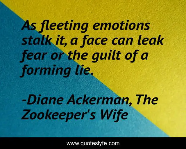 This page presents the quote "As fleeting emotions stalk it, a face can leak fear or the guilt of a forming lie.". Author of this quote is Diane Ackerman, The Zookeeper's Wife. .