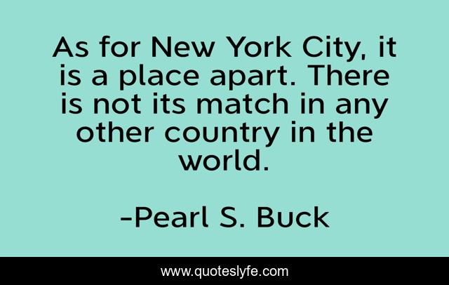 This page presents the quote "As for New York City, it is a place apart. There is not its match in any other country in the world.". Author of this quote is Pearl S. Buck. .