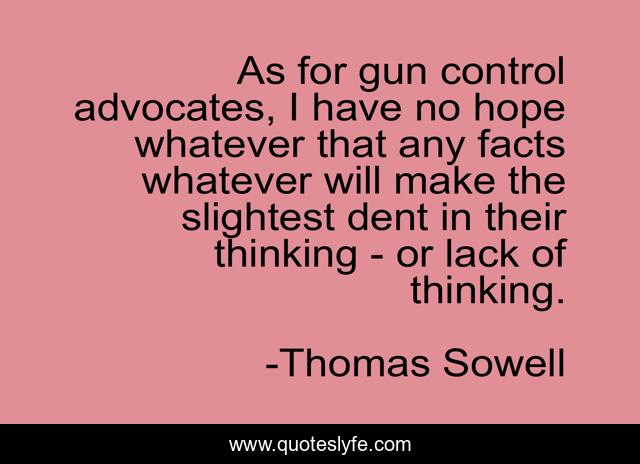 This page presents the quote "As for gun control advocates, I have no hope whatever that any facts whatever will make the slightest dent in their thinking - or lack of thinking.". Author of this quote is Thomas Sowell. This quote is about thinking, gun control,.