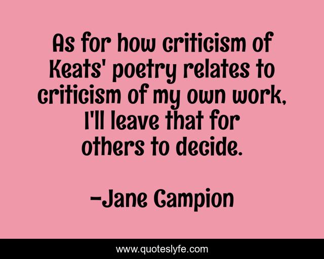 This page presents the quote "As for how criticism of Keats' poetry relates to criticism of my own work, I'll leave that for others to decide.". Author of this quote is Jane Campion. This quote is about criticism, work, my own,.