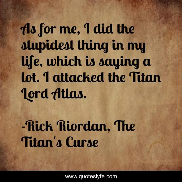 This page presents the quote "As for me, I did the stupidest thing in my life, which is saying a lot. I attacked the Titan Lord Atlas.". Author of this quote is Rick Riordan, The Titan's Curse. This quote is about atlas, attack, stupid, percy-jackson,.
