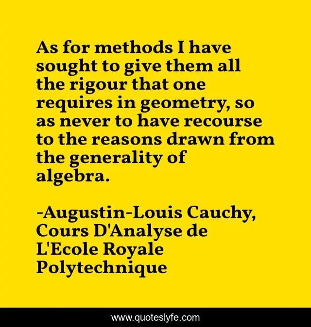 This page presents the quote "As for methods I have sought to give them all the rigour that one requires in geometry, so as never to have recourse to the reasons drawn from the generality of algebra.". Author of this quote is Augustin-Louis Cauchy, Cours D'Analyse de L'Ecole Royale Polytechnique. This quote is about methods, algebra, geometry, science, reason, rigour, mathematics, math,.