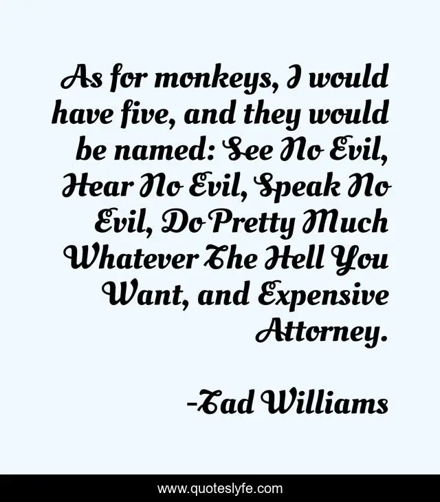 This page presents the quote "As for monkeys, I would have five, and they would be named: See No Evil, Hear No Evil, Speak No Evil, Do Pretty Much Whatever The Hell You Want, and Expensive Attorney.". Author of this quote is Tad Williams. .