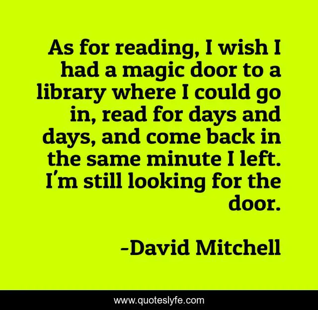 This page presents the quote "As for reading, I wish I had a magic door to a library where I could go in, read for days and days, and come back in the same minute I left. I'm still looking for the door.". Author of this quote is David Mitchell. This quote is about door, guardian, library, webchat, libraries, books, interview, reading,.