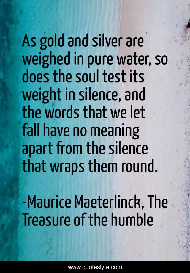 This page presents the quote "As gold and silver are weighed in pure water, so does the soul test its weight in silence, and the words that we let fall have no meaning apart from the silence that wraps them round.". Author of this quote is Maurice Maeterlinck, The Treasure of the humble. This quote is about silence, testing, soul, words, gold-and-silver,.