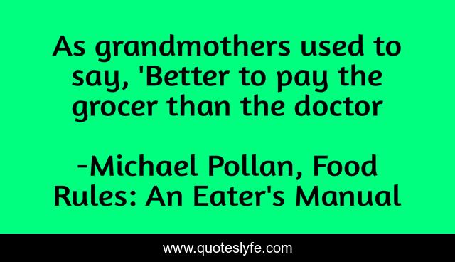 This page presents the quote "As grandmothers used to say, 'Better to pay the grocer than the doctor". Author of this quote is Michael Pollan, Food Rules: An Eater's Manual. This quote is about food, health-care,.