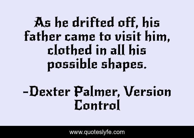 This page presents the quote "As he drifted off, his father came to visit him, clothed in all his possible shapes.". Author of this quote is Dexter Palmer, Version Control. This quote is about shapeshifter, version-control, dreams, dexter-palmer, possibility,.
