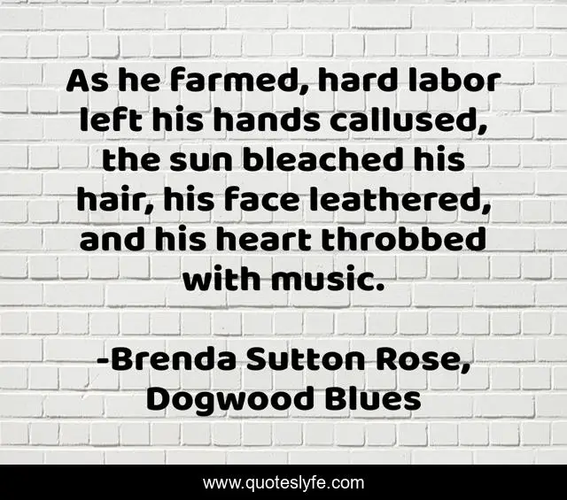 This page presents the quote "As he farmed, hard labor left his hands callused, the sun bleached his hair, his face leathered, and his heart throbbed with music.". Author of this quote is Brenda Sutton Rose, Dogwood Blues. This quote is about callused-hands, hard-work, farmers, calluses, hands, southern-fiction, music, farmer,.
