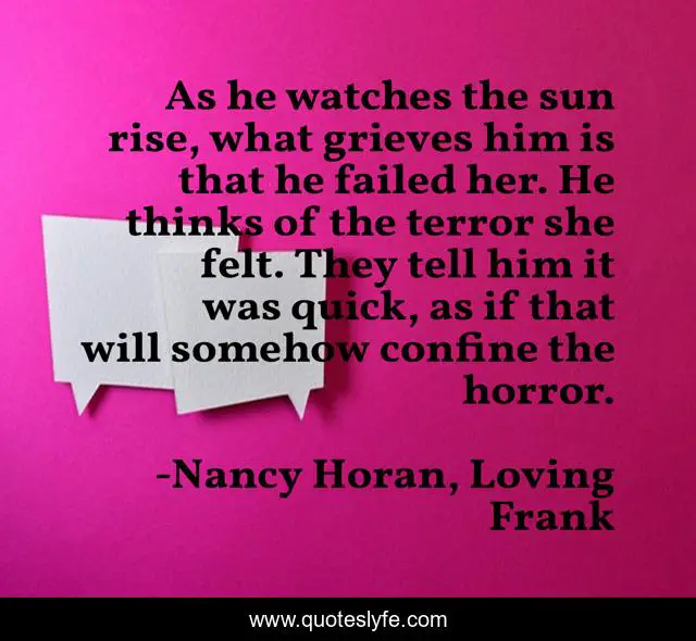 This page presents the quote "As he watches the sun rise, what grieves him is that he failed her. He thinks of the terror she felt. They tell him it was quick, as if that will somehow confine the horror.". Author of this quote is Nancy Horan, Loving Frank. This quote is about death, murder, grieving,.