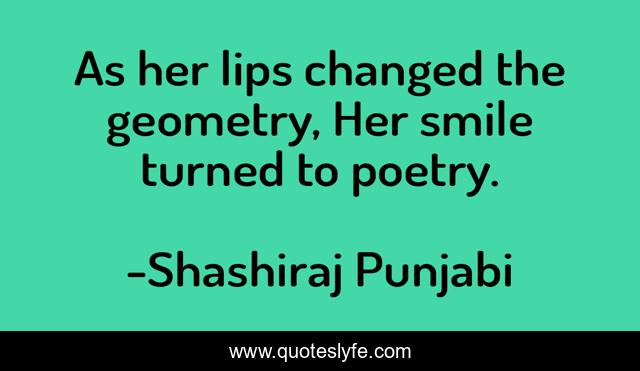 This page presents the quote "As her lips changed the geometry, Her smile turned to poetry.". Author of this quote is Shashiraj Punjabi. This quote is about life, lovers, love, poetry, lovestory, inspirational, enthusiasm, lovesick, affection,.