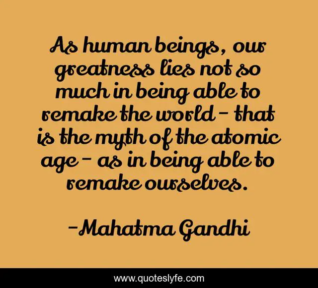 This page presents the quote "As human beings, our greatness lies not so much in being able to remake the world - that is the myth of the atomic age - as in being able to remake ourselves.". Author of this quote is Mahatma Gandhi. This quote is about self-improvement, self-development,.