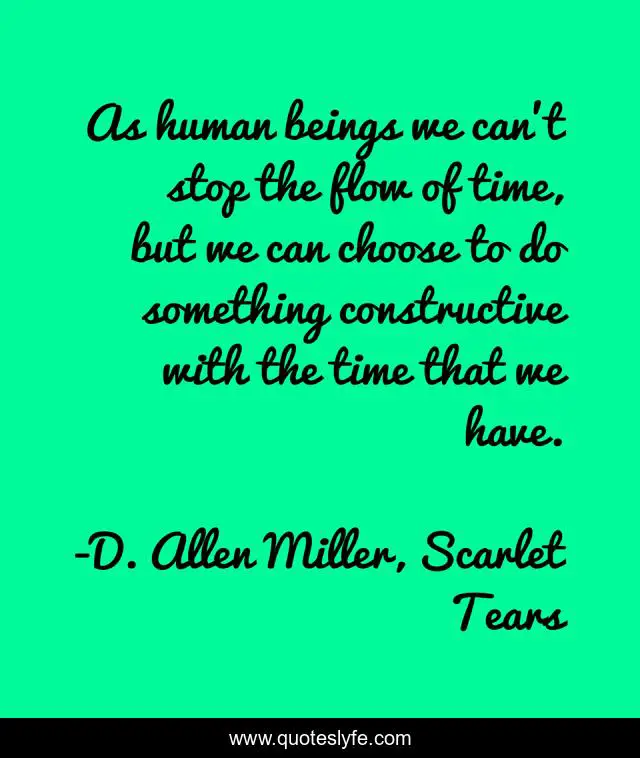 This page presents the quote "As human beings we can't stop the flow of time, but we can choose to do something constructive with the time that we have.". Author of this quote is D. Allen Miller, Scarlet Tears. This quote is about positivity, time,.