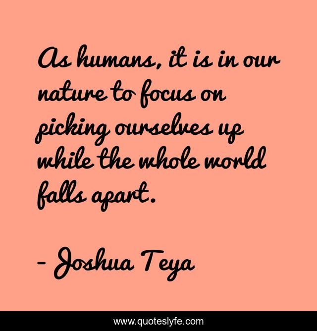 This page presents the quote "As humans, it is in our nature to focus on picking ourselves up while the whole world falls apart.". Author of this quote is Joshua Teya. This quote is about human-nature, life-philosophy,.