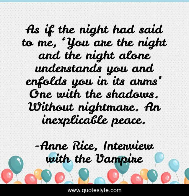 This page presents the quote "As if the night had said to me, ‘You are the night and the night alone understands you and enfolds you in its arms’ One with the shadows. Without nightmare. An inexplicable peace.". Author of this quote is Anne Rice, Interview with the Vampire. .