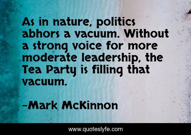 This page presents the quote "As in nature, politics abhors a vacuum. Without a strong voice for more moderate leadership, the Tea Party is filling that vacuum.". Author of this quote is Mark McKinnon. This quote is about politics, strong, nature,.