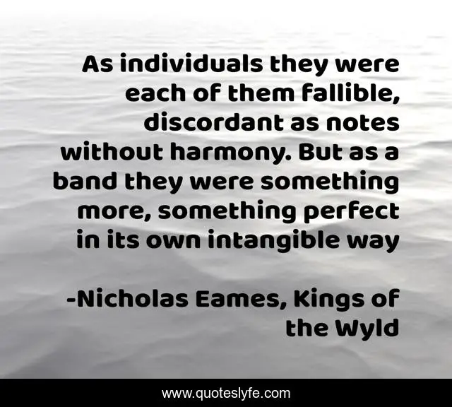This page presents the quote "As individuals they were each of them fallible, discordant as notes without harmony. But as a band they were something more, something perfect in its own intangible way". Author of this quote is Nicholas Eames, Kings of the Wyld. This quote is about band, friendship,.