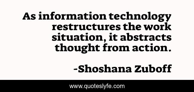 This page presents the quote "As information technology restructures the work situation, it abstracts thought from action.". Author of this quote is Shoshana Zuboff. This quote is about thought, action, work,.