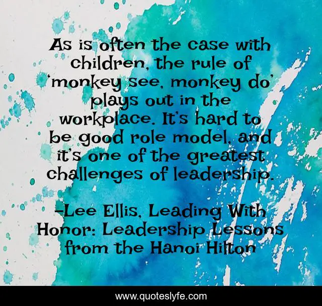This page presents the quote "As is often the case with children, the rule of ‘monkey see, monkey do’ plays out in the workplace. It’s hard to be good role model, and it’s one of the greatest challenges of leadership.". Author of this quote is Lee Ellis, Leading With Honor: Leadership Lessons from the Hanoi Hilton. This quote is about military, leadership, business,.