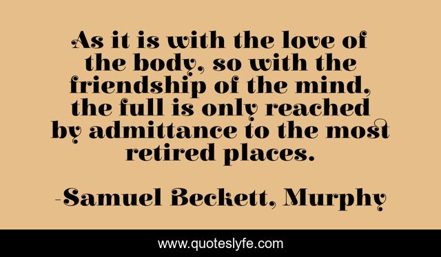 This page presents the quote "As it is with the love of the body, so with the friendship of the mind, the full is only reached by admittance to the most retired places.". Author of this quote is Samuel Beckett, Murphy. This quote is about friendship, mind,.