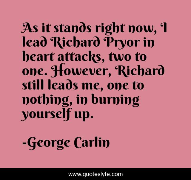 This page presents the quote "As it stands right now, I lead Richard Pryor in heart attacks, two to one. However, Richard still leads me, one to nothing, in burning yourself up.". Author of this quote is George Carlin. This quote is about funny, comedy, humor,.
