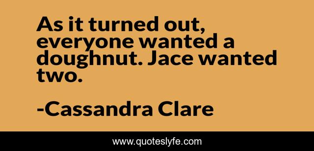 This page presents the quote "As it turned out, everyone wanted a doughnut. Jace wanted two.". Author of this quote is Cassandra Clare. This quote is about donut, jace-wayland, humor, doughnut, gluttony,.