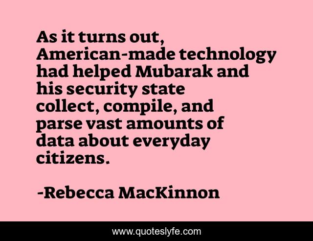 This page presents the quote "As it turns out, American-made technology had helped Mubarak and his security state collect, compile, and parse vast amounts of data about everyday citizens.". Author of this quote is Rebecca MacKinnon. This quote is about security, citizens, data,.