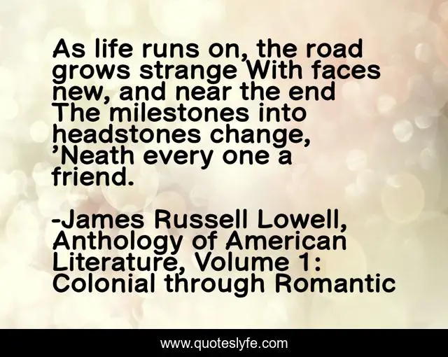 This page presents the quote "As life runs on, the road grows strange With faces new, and near the end The milestones into headstones change, ’Neath every one a friend.". Author of this quote is James Russell Lowell, Anthology of American Literature, Volume 1: Colonial through Romantic. This quote is about life, death, growing-old, growing-up,.