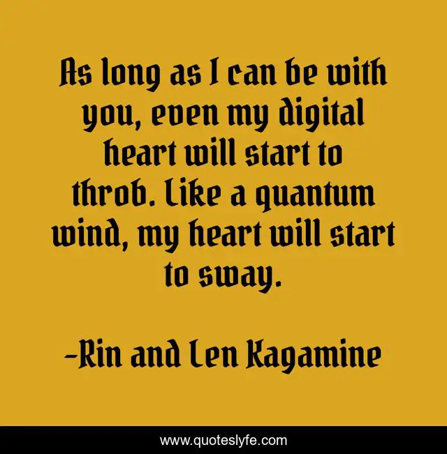 This page presents the quote "As long as I can be with you, even my digital heart will start to throb. Like a quantum wind, my heart will start to sway.". Author of this quote is Rin and Len Kagamine. This quote is about eletric, vocaloid, angel, song,.