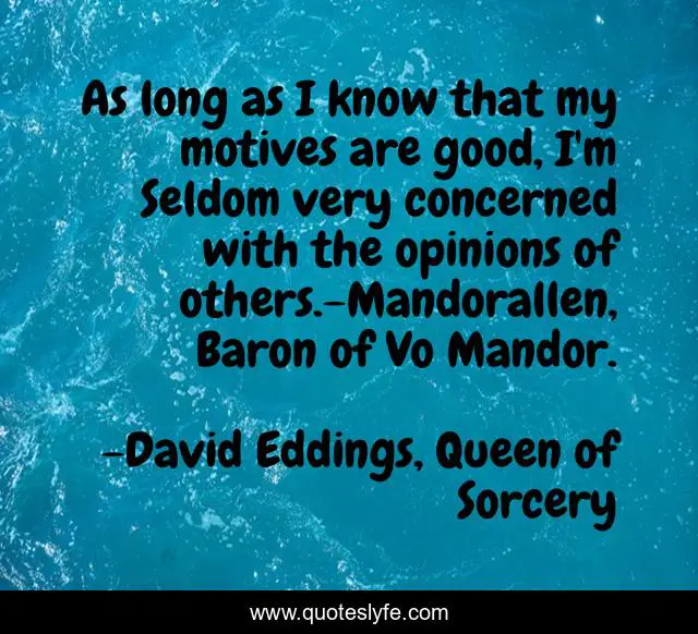 This page presents the quote "As long as I know that my motives are good, I'm Seldom very concerned with the opinions of others.-Mandorallen, Baron of Vo Mandor.". Author of this quote is David Eddings, Queen of Sorcery. This quote is about enthusiasm, inspirational, morality,.