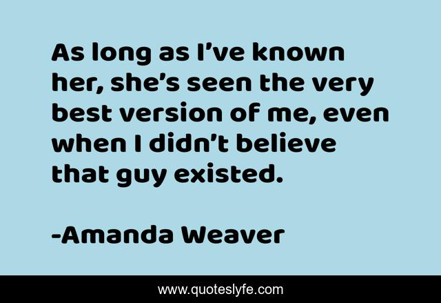 This page presents the quote "As long as I’ve known her, she’s seen the very best version of me, even when I didn’t believe that guy existed.". Author of this quote is Amanda Weaver. This quote is about new-adult, college-romance, contemporary-romance,.