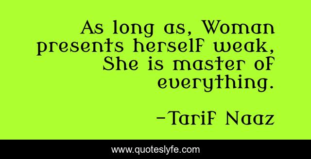 This page presents the quote "As long as, Woman presents herself weak, She is master of everything.". Author of this quote is Tarif Naaz. This quote is about master, woman, weak,.