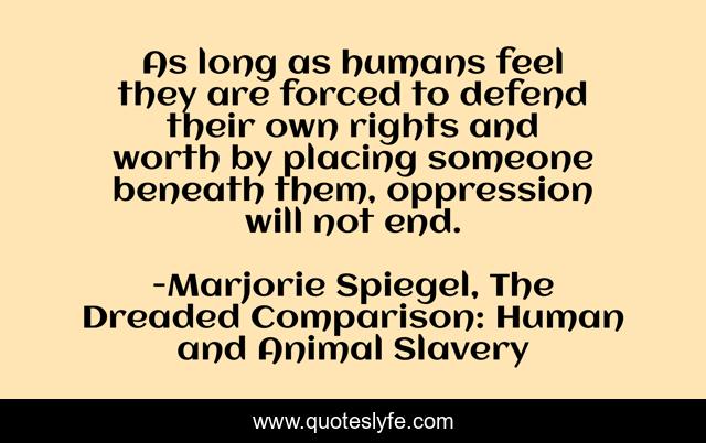 This page presents the quote "As long as humans feel they are forced to defend their own rights and worth by placing someone beneath them, oppression will not end.". Author of this quote is Marjorie Spiegel, The Dreaded Comparison: Human and Animal Slavery. This quote is about human-nature, human-rights, animals, slavery, animal-rights,.