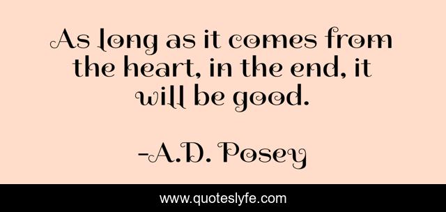 This page presents the quote "As long as it comes from the heart, in the end, it will be good.". Author of this quote is A.D. Posey. This quote is about heart, story, good, storytelling, storytellers, writing, write, writers, ad-posey,.